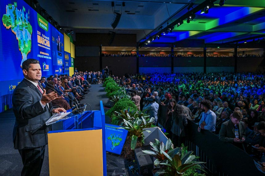 O presidente do Senado, Davi Alcolumbre, discursa em 2025 da Marcha dos Prefeitos, em Brasília: em viagens à capital federal, prefeitos se reúnem com parlamentares para tratar de emendas (Pedro Gontijo/Agência Senado)