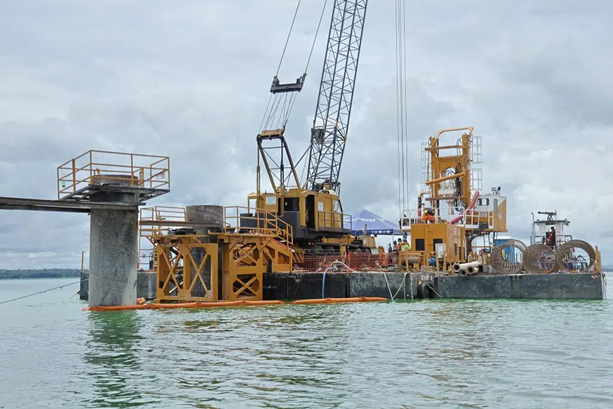 Para a execução do projeto, são utilizadas balsas e embarcações de apoio. Todos os equipamentos necessários para a obra – como o guindaste com martelo de cravação de tubos – ficam nessa estrutura de apoio. As balsas são posicionadas no local exato para cravação dos tubos, também chamados de “camisas metálicas”, que servirão de forma para execução das estacas. Após a cravação, é feita a limpeza das camisas e inserção da “gaiola” de armação e a concretagem de baixo para cima, expulsando a água ali contida.
